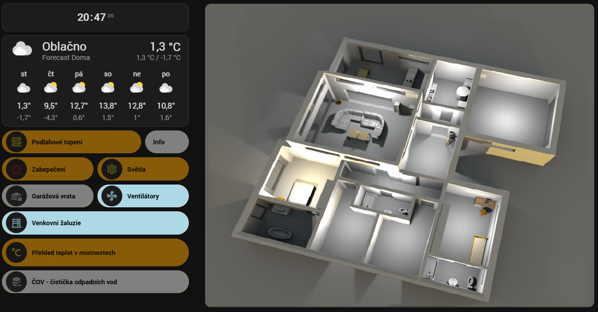 Ovládání domu přes home assistant - změna vizualizace řízení a nastavení domů (svetla, střešní žaluzie, zabezpečení a řízení podlahového vytápění).